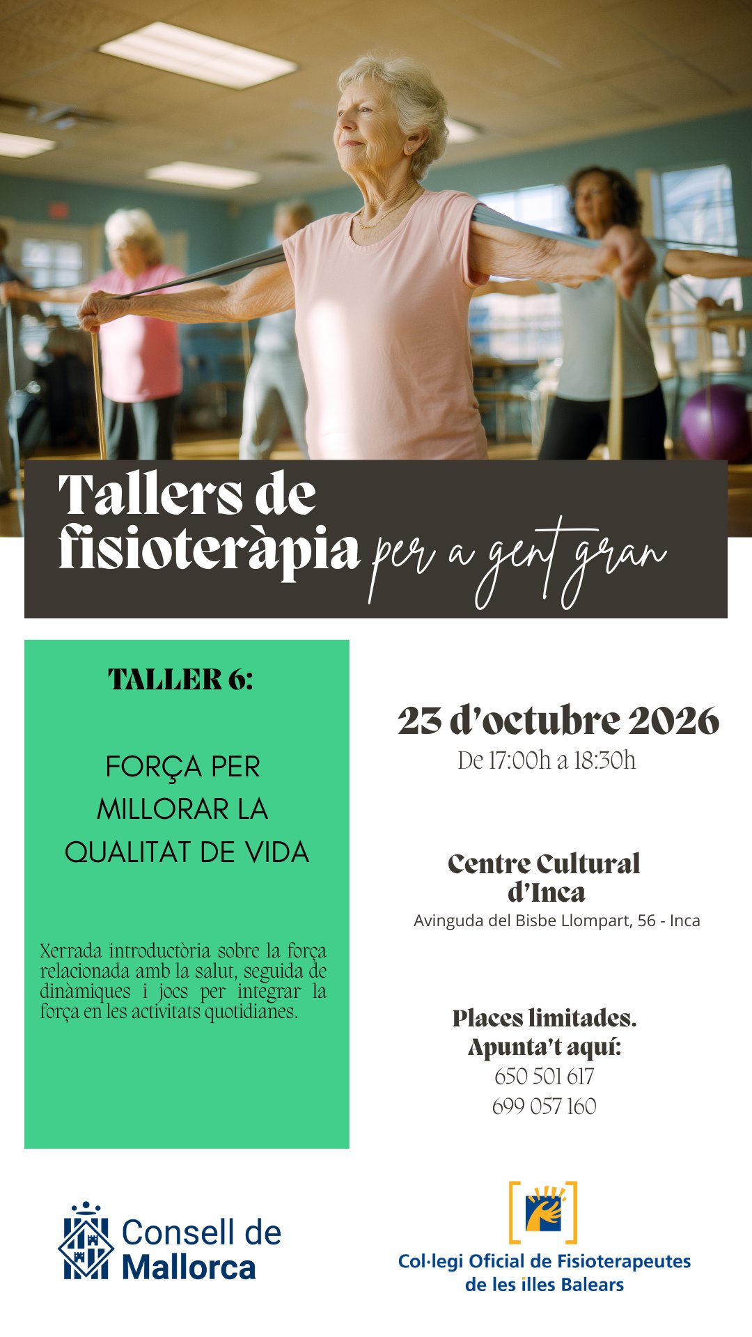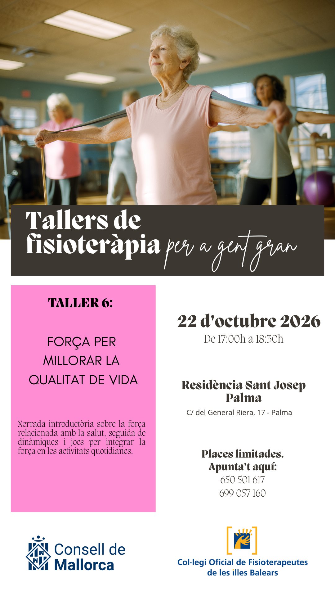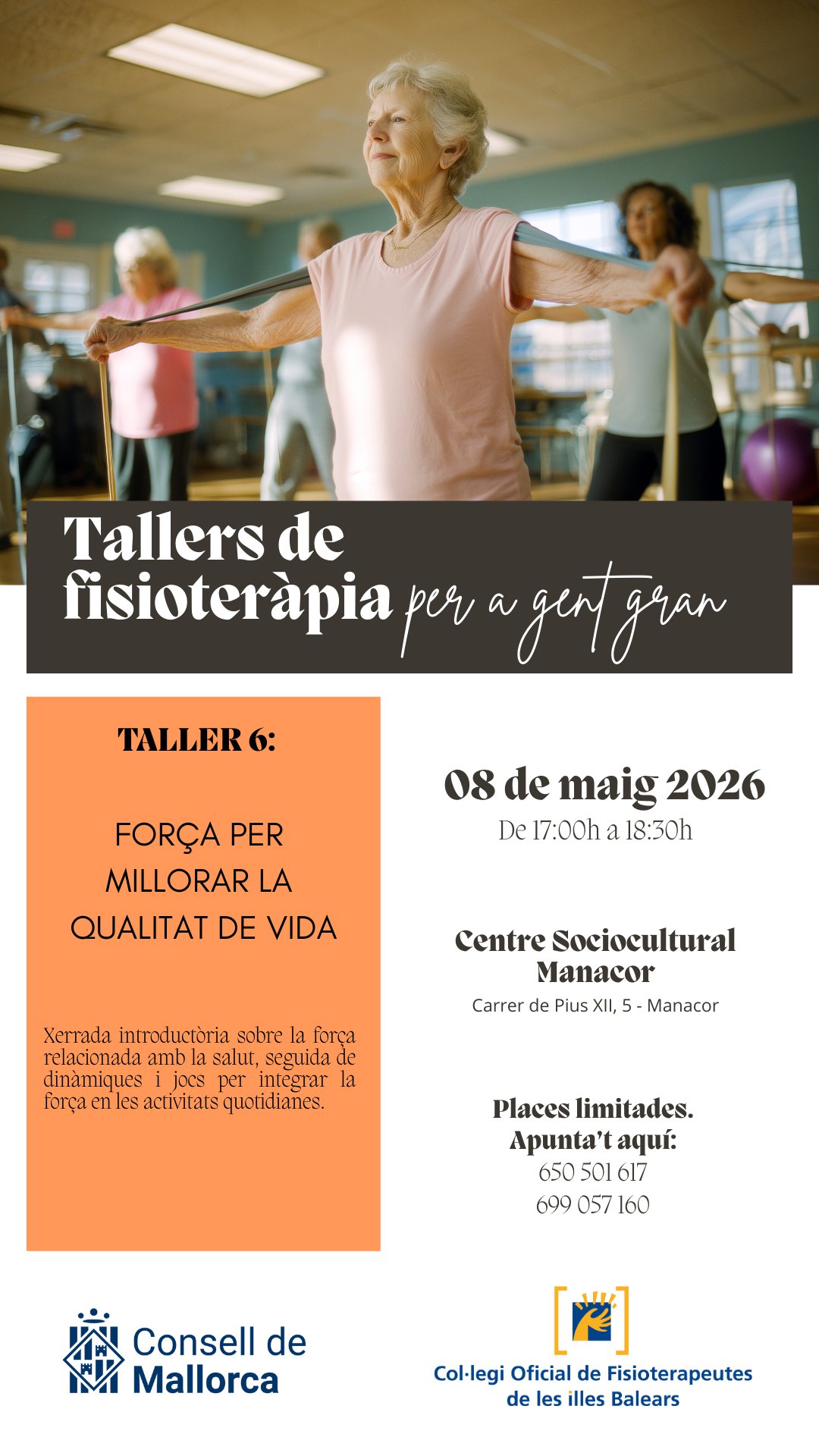 En este apartado os informamos de los próximos talleres organizados por el Consell de Mallorca y el Colegio Oficial de Fisioterapeutas de las Islas Baleares que se llevarán a cabo en Palma, Inca y Manacor dirigidos a la población adulta y desarrollados por fisioterapeutas.