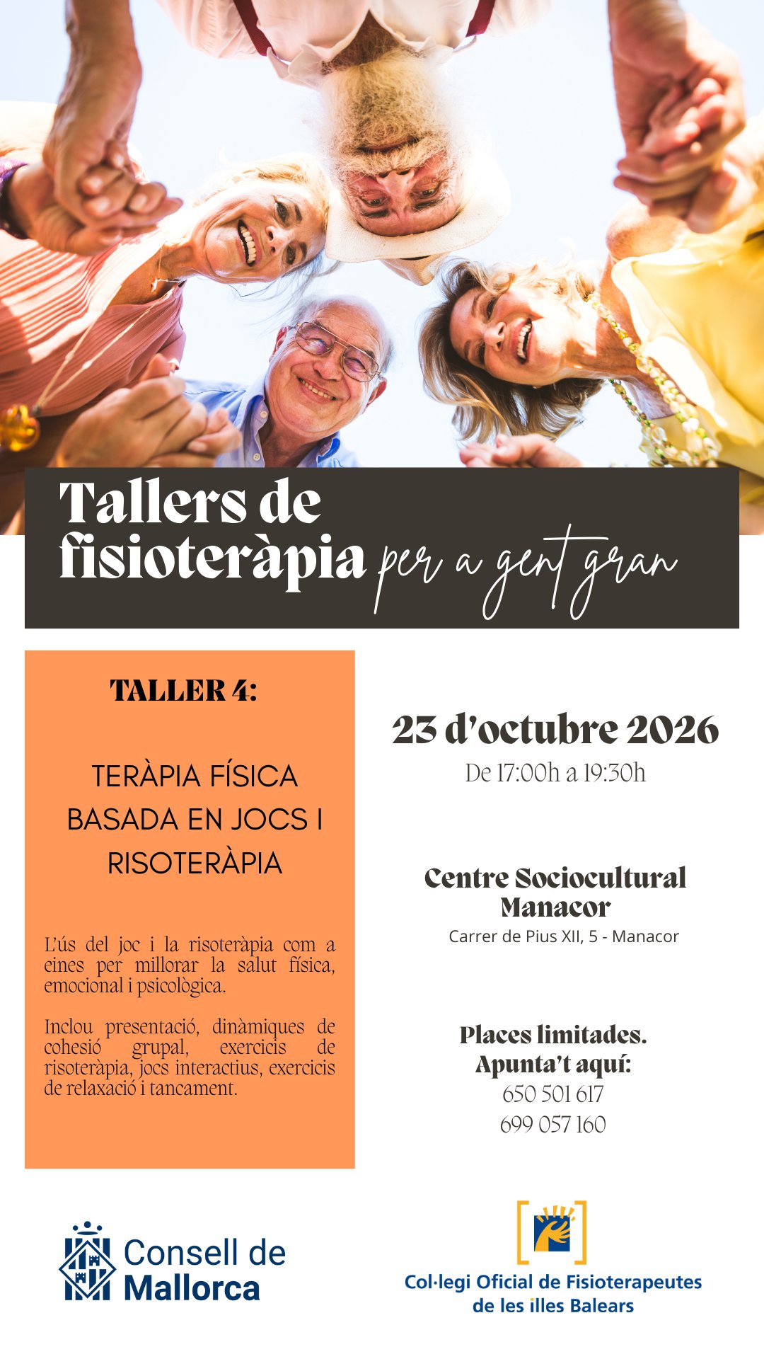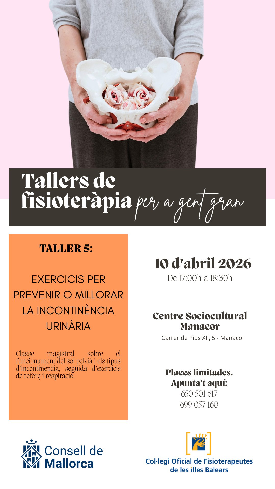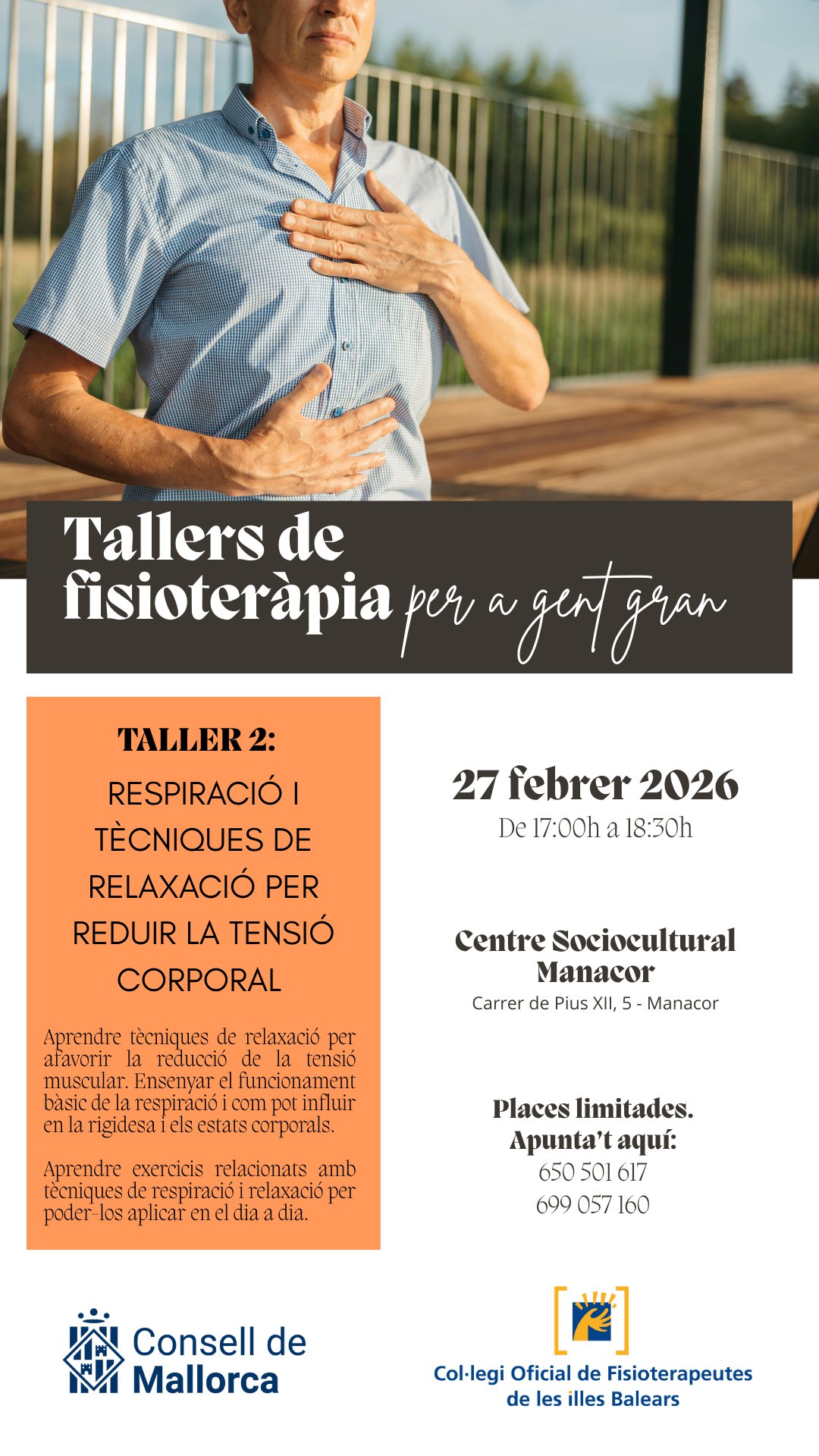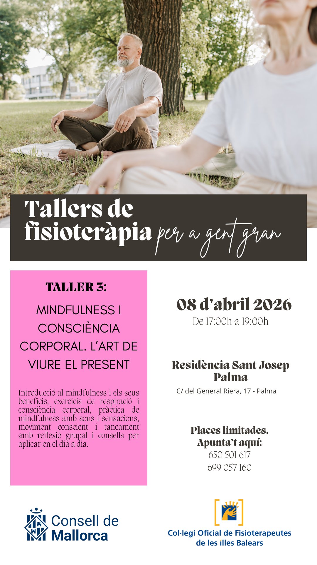 En este apartado os informamos de los próximos talleres organizados por el Consell de Mallorca y el Colegio Oficial de Fisioterapeutas de las Islas Baleares que se llevarán a cabo en Palma, Inca y Manacor dirigidos a la población adulta y desarrollados por fisioterapeutas.