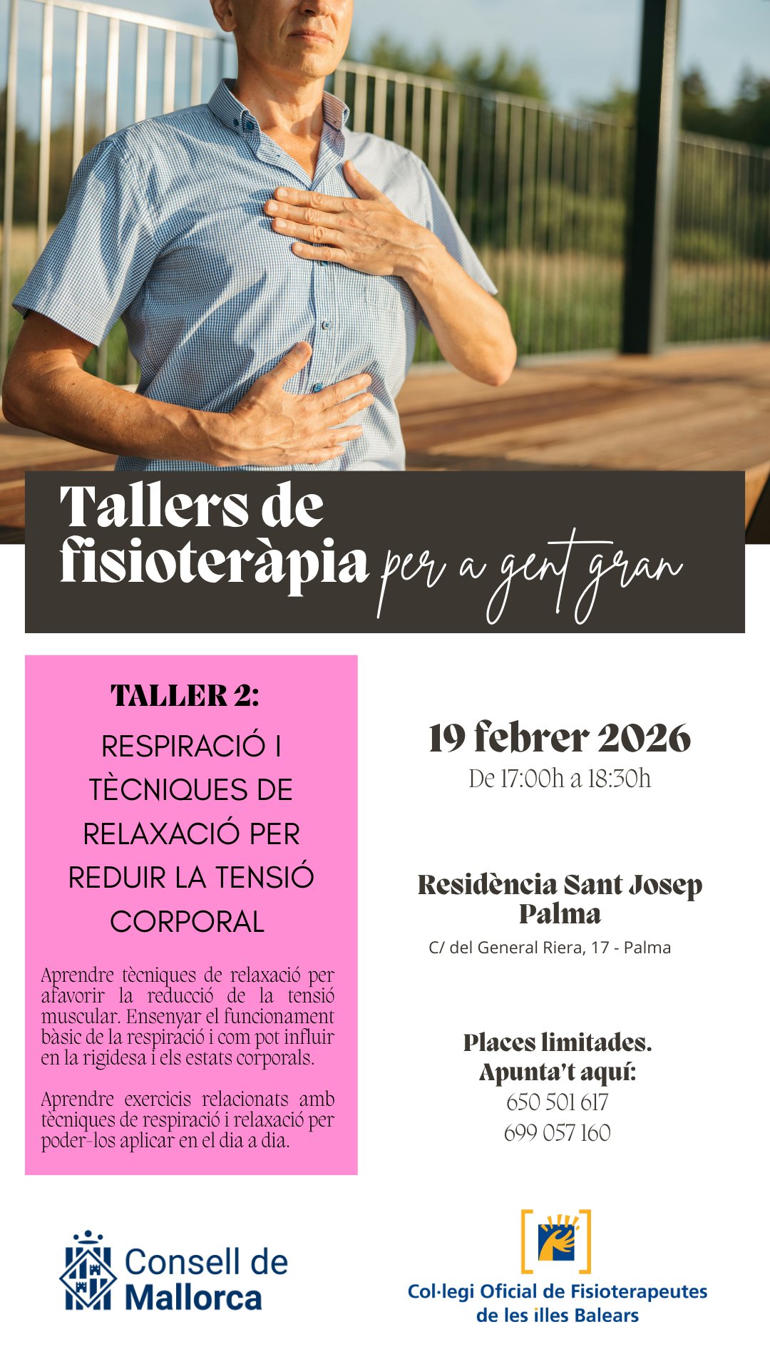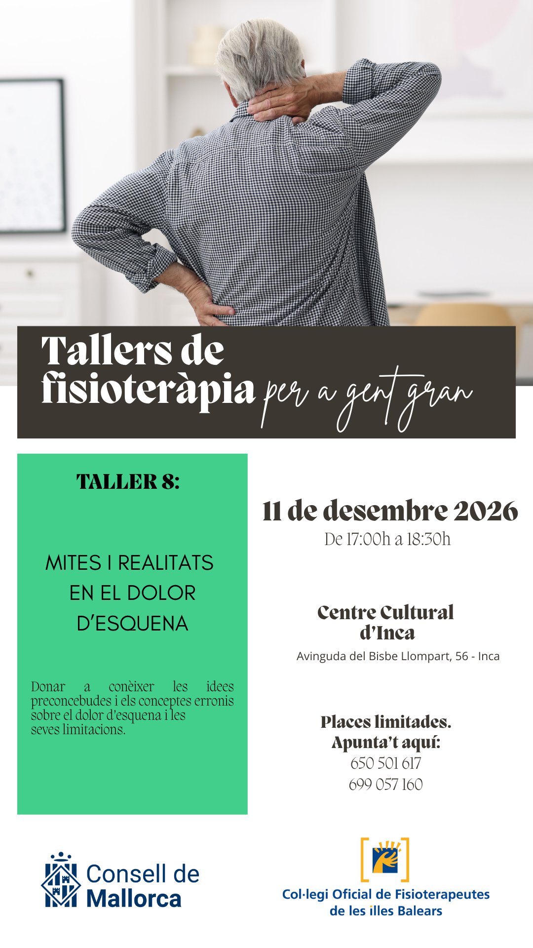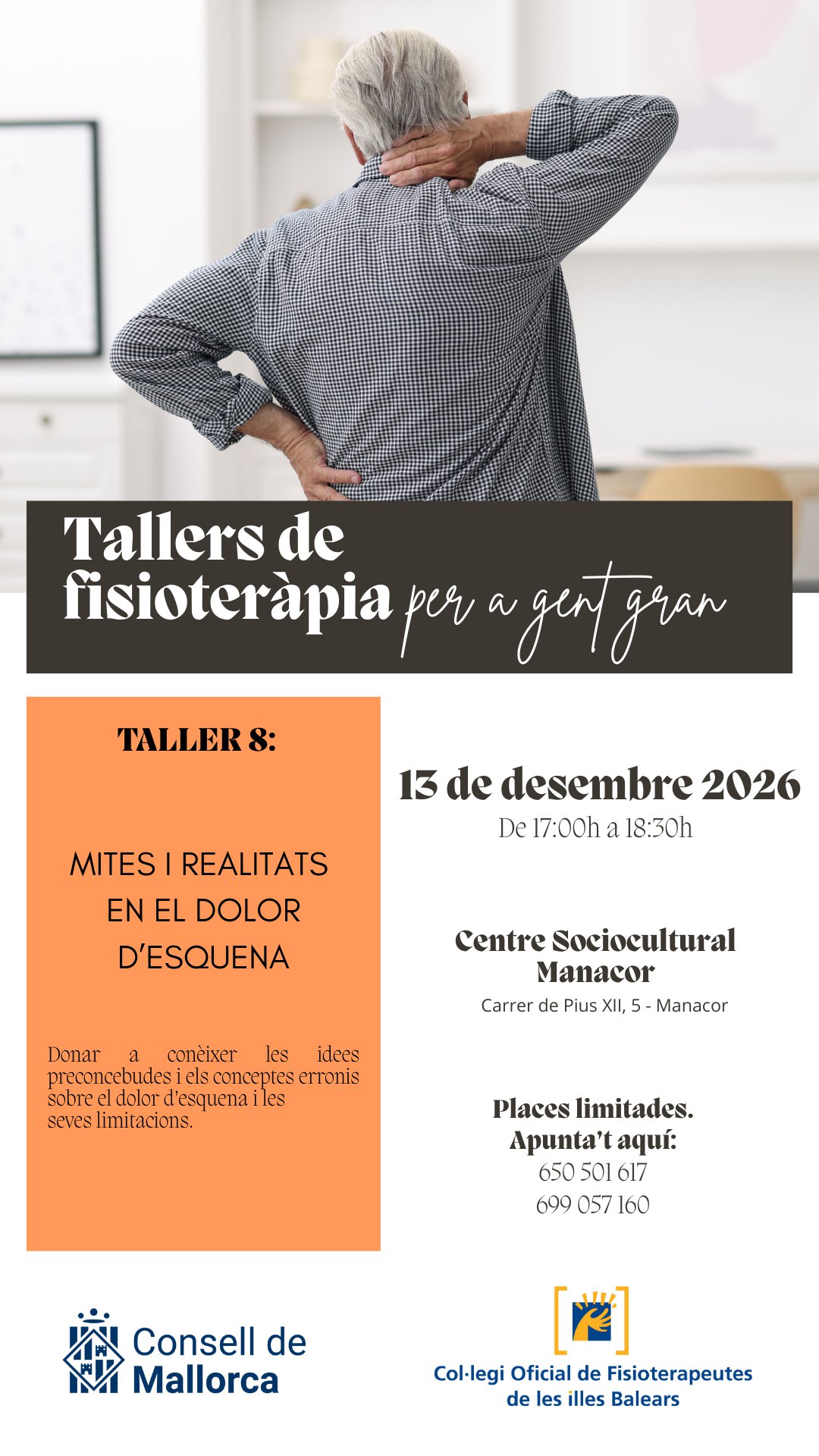 En este apartado os informamos de los próximos talleres organizados por el Consell de Mallorca y el Colegio Oficial de Fisioterapeutas de las Islas Baleares que se llevarán a cabo en Palma, Inca y Manacor dirigidos a la población adulta y desarrollados por fisioterapeutas.