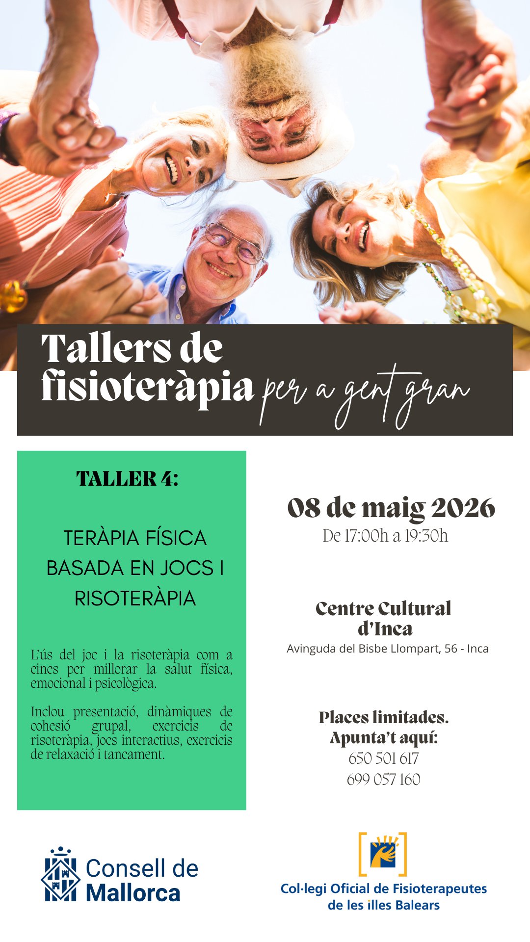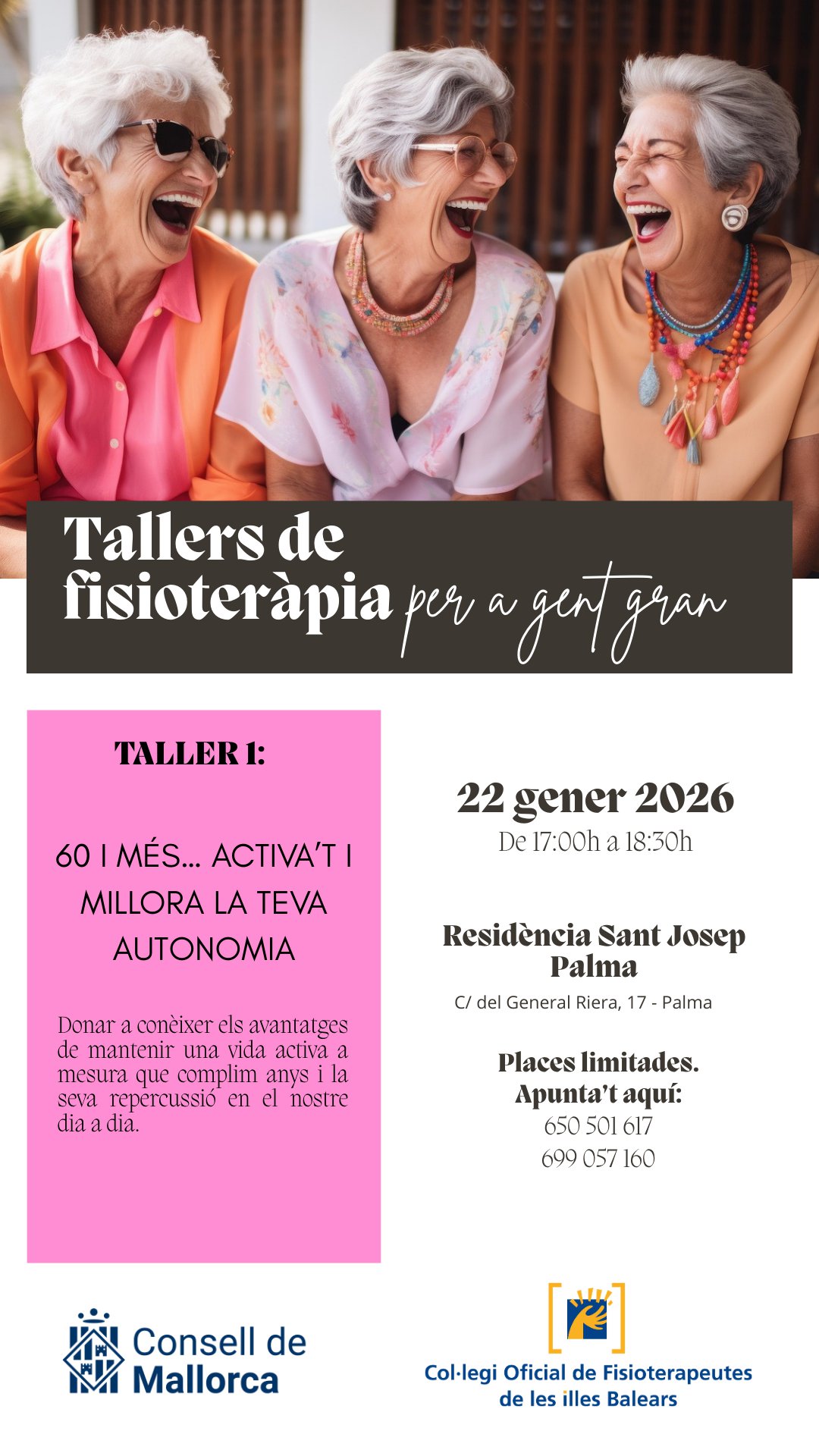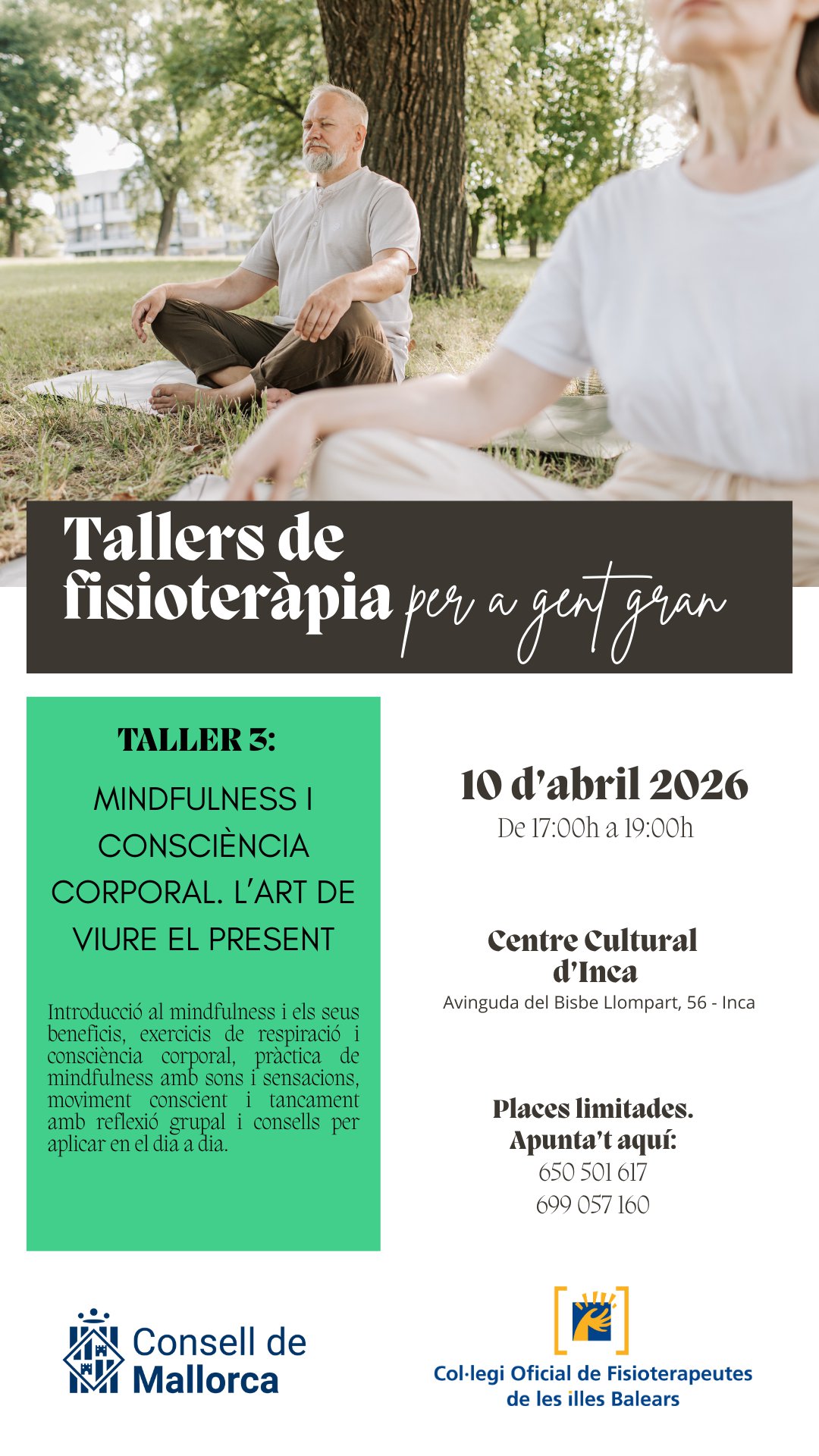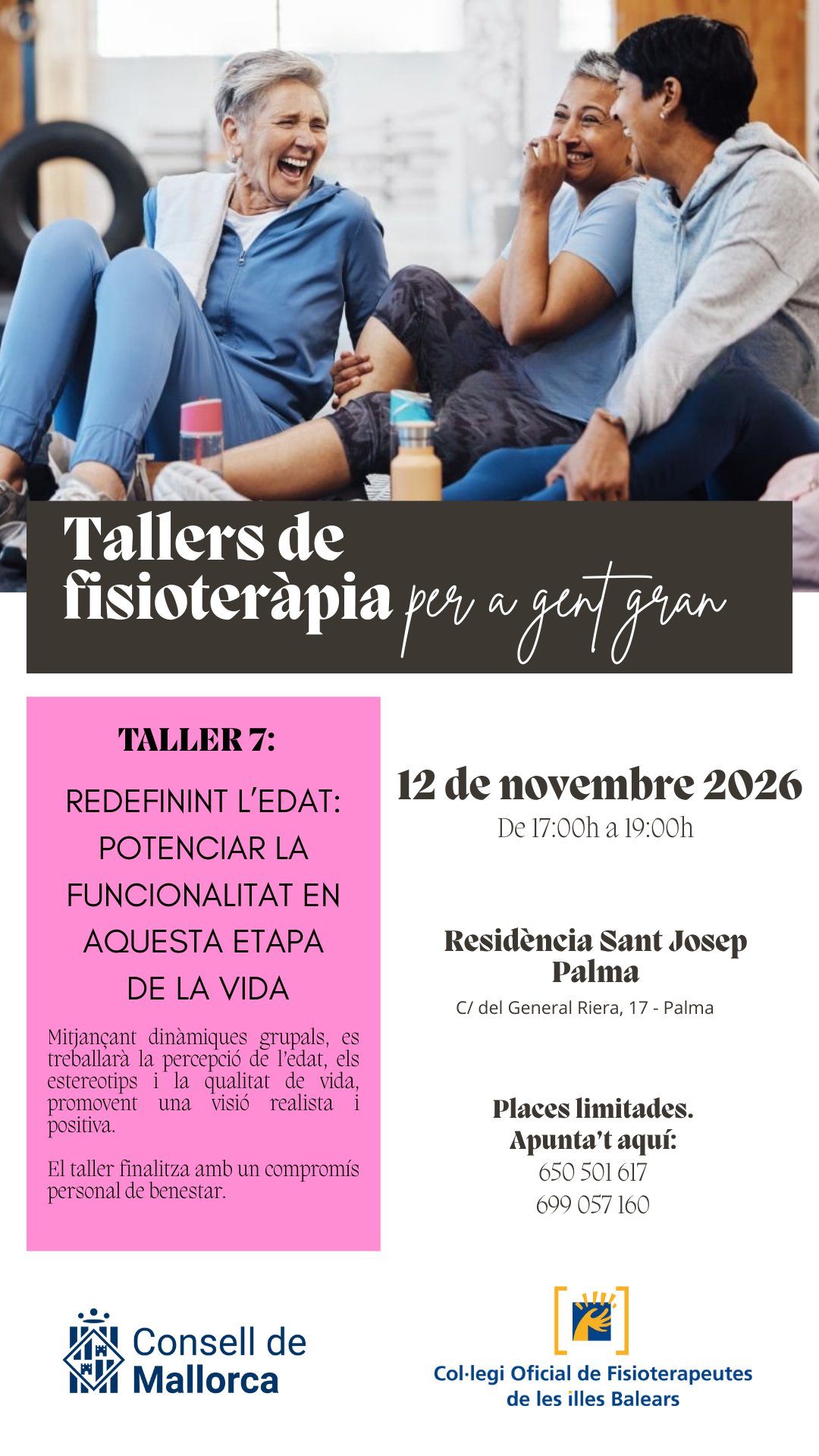 En este apartado os informamos de los próximos talleres organizados por el Consell de Mallorca y el Colegio Oficial de Fisioterapeutas de las Islas Baleares que se llevarán a cabo en Palma, Inca y Manacor dirigidos a la población adulta y desarrollados por fisioterapeutas.
