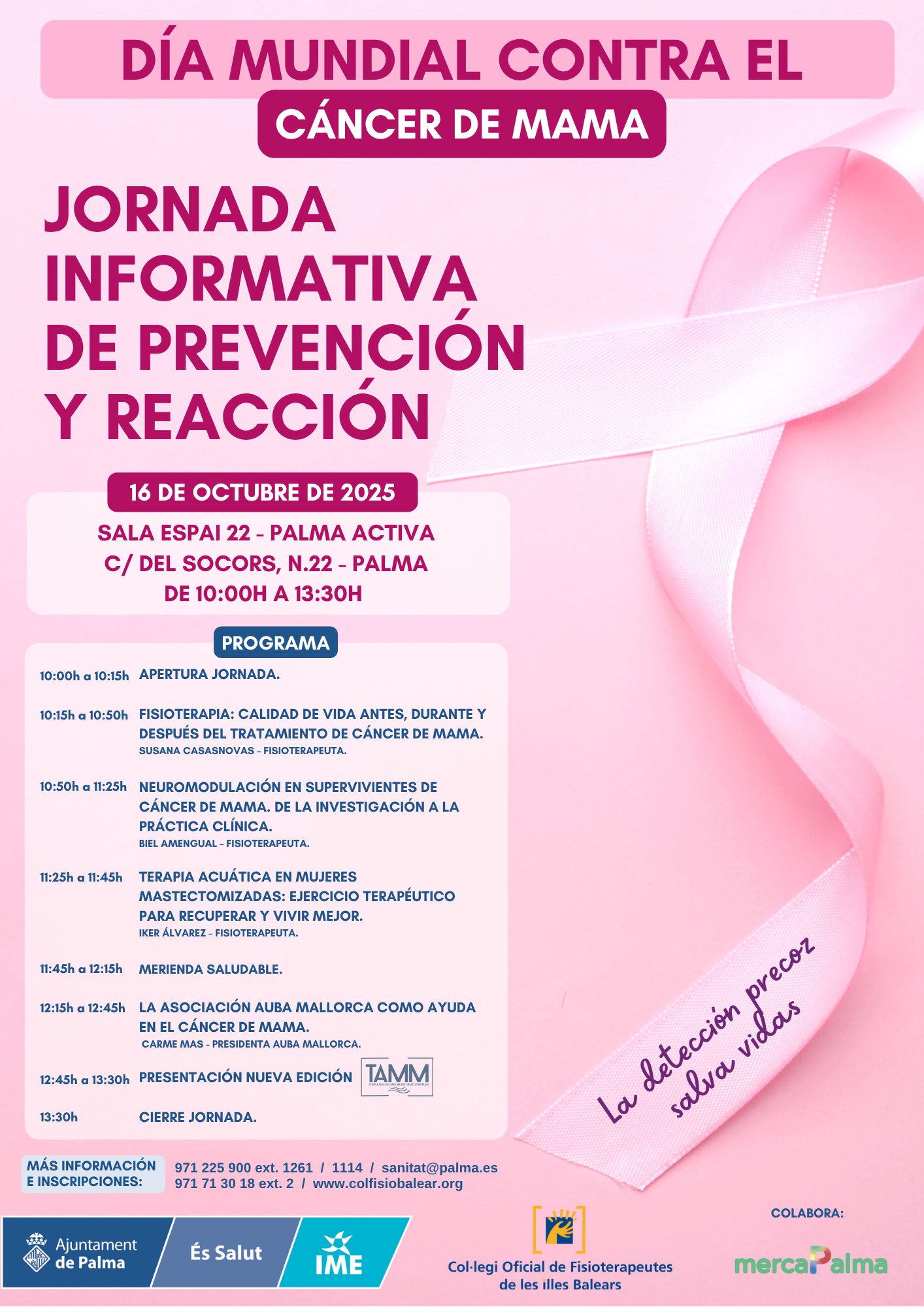 El Área de Salud del Ayuntamiento de Palma junto con el Instituto Municipal de Deportes y el Colegio Oficial de Fisioterapeutas de las Islas Baleares, os invita a una Jornada informativa dedicada a la prevención y reacción frente al cáncer de mama, en el marco del Día Mundial de lucha contra esta enfermedad.
